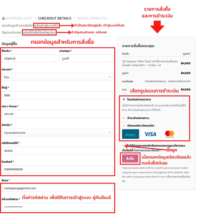 เมื่อเราเข้าสู่หน้ากรอกรายละเอียดแล้ว ในกรณีที่เราเคยสั่งซื้อ หรือเป็นสมาชิกอยู่แล้ว ให้เราคลิกเข้าสู่ระบบได้เลย หรือ ถ้ายังไม่เป็นสมาชิกก็ไม่เป็นไร ระบบจะจัดการให้อัตโนมัติ จากนั้นกรอกข้อมูลให้ครบถ้วน และ เลือกวิธีการชำระเงินให้เรียบร้อย จากนั้นตรวจสอบรายละเอียดว่า ครบถ้วนถูกต้องไหม