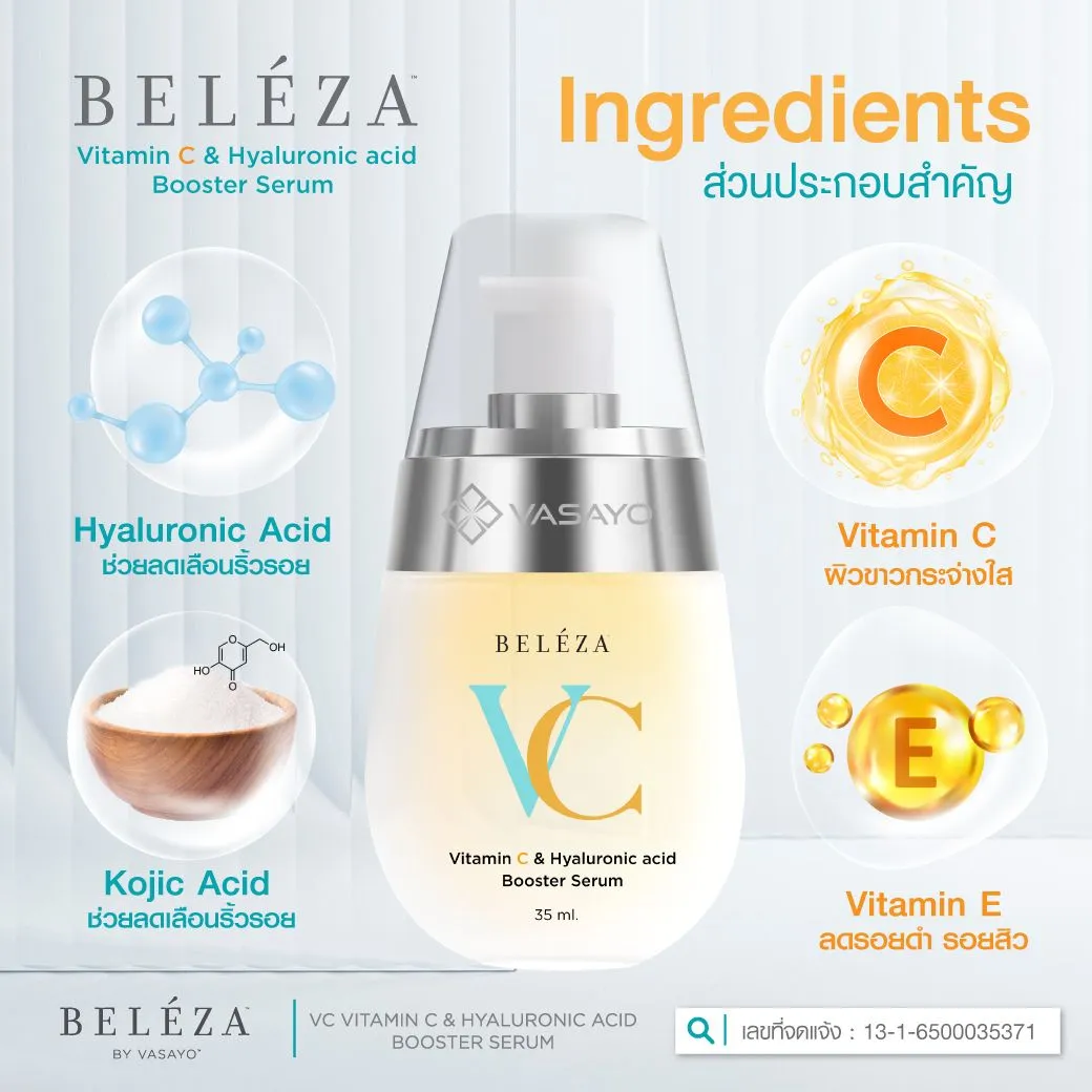 Beleza VC Vitamin C & Hyaluronic Acid Booster Serum VONCE บูสเตอร์ เซรั่มบำรุงผิวหน้า ที่อุดมไปด้วยวิตามินซี มีคุณสมบัติในด้านการบำรุงผิวหน้าให้ขาวสว่าง กระจ่างใส ซึมสู่ผิวเพื่อเข้าไปกระตุ้นการทำงานของเซลล์ผิวหน้าให้ดีขึ้น เติมร่องลึกให้ดูอิ่มฟู และทำงานได้อย่างปกติคงไว้เพียงใบหน้าที่แลดูกระจ่างใส และสุขภาพดี