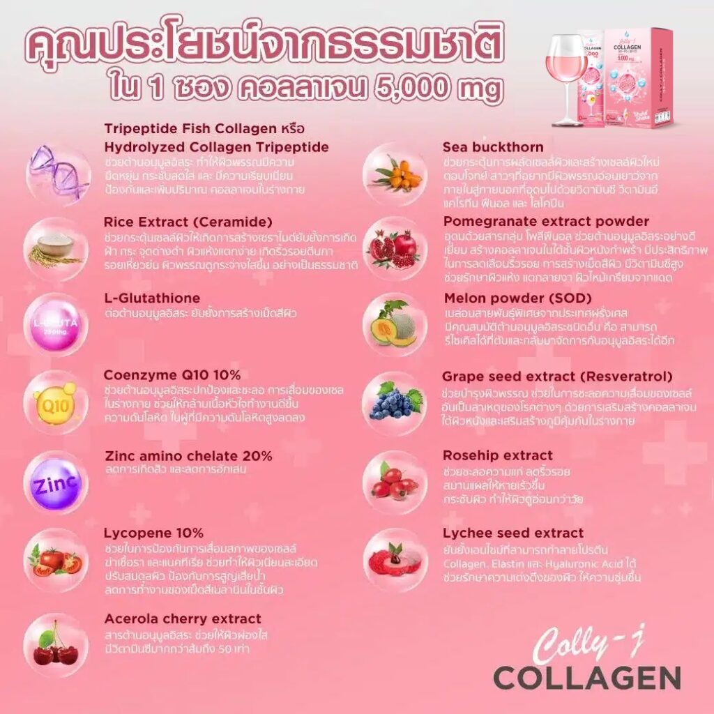 Colly J Collagen คอลลี่ เจ คอลลาเจน คอลลาเจนผิวขาว 5000 mg ไฮโดรไลซ์คอลลาเจนไตรเปปไทด์ เป็นคอลลาเจนที่ผ่านการย่อยด้วยกรดจนได้ขนาดอนุภาคเล็กมาก ซึ่งขนาดยิ่งเล็กเท่าใดจะบ่งบอกถึงประสิทธิภาพในการดูดซึมที่ดียิ่งขึ้น ดูดซึมได้ดีกว่า คอลลาเจนทั่วไป 3-4 เท่า สกัดจากปลาทะเลน้ำลึก มีลักษณะคล้ายโครงสร้างคอลลาเจนของผิวคน