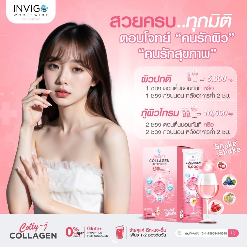 ใน Colly J Collagen 1 ซอง มีปริมาณคอลลาเจนอยู่ 5,000 mg. ซึ่งเพียงพอต่อความต้องการของร่างกายใน 1 วันแล้ว